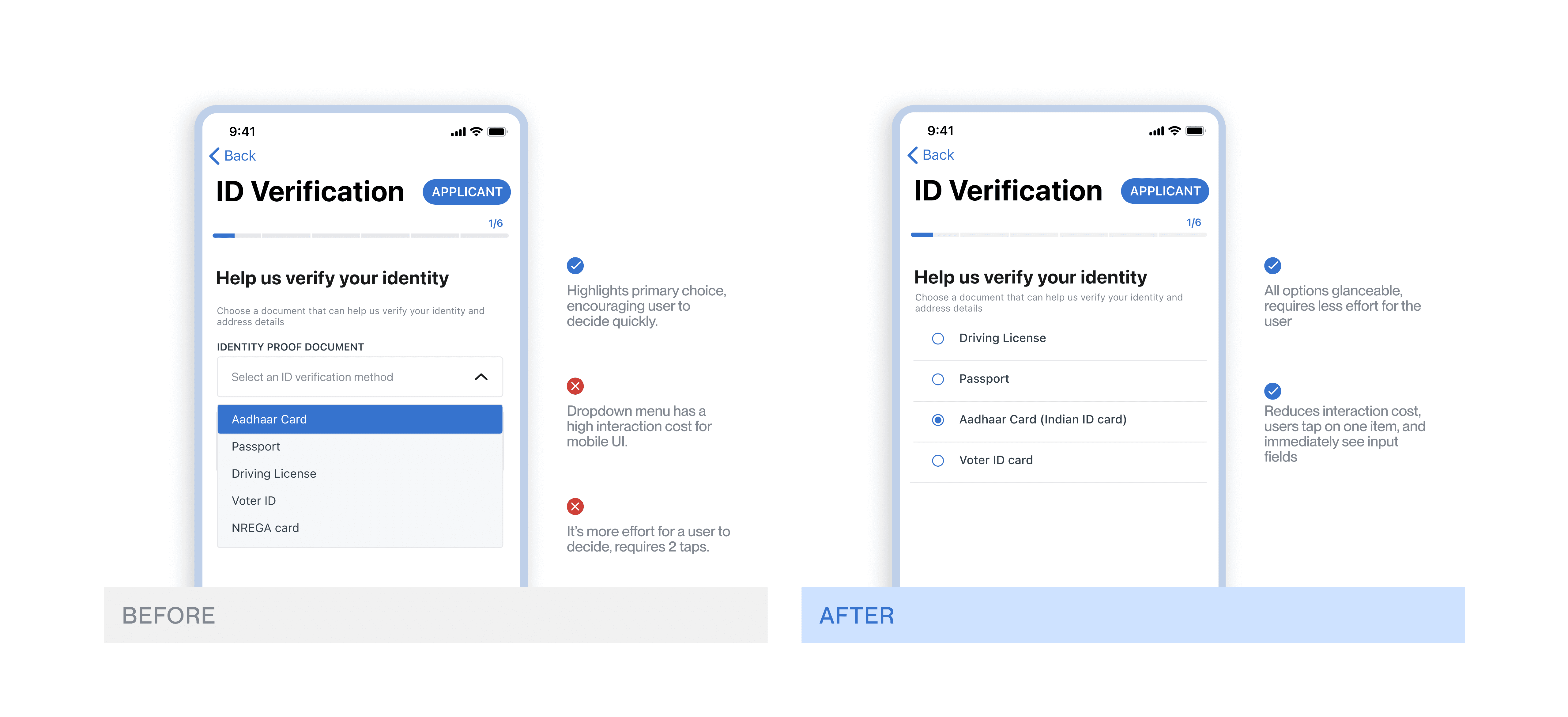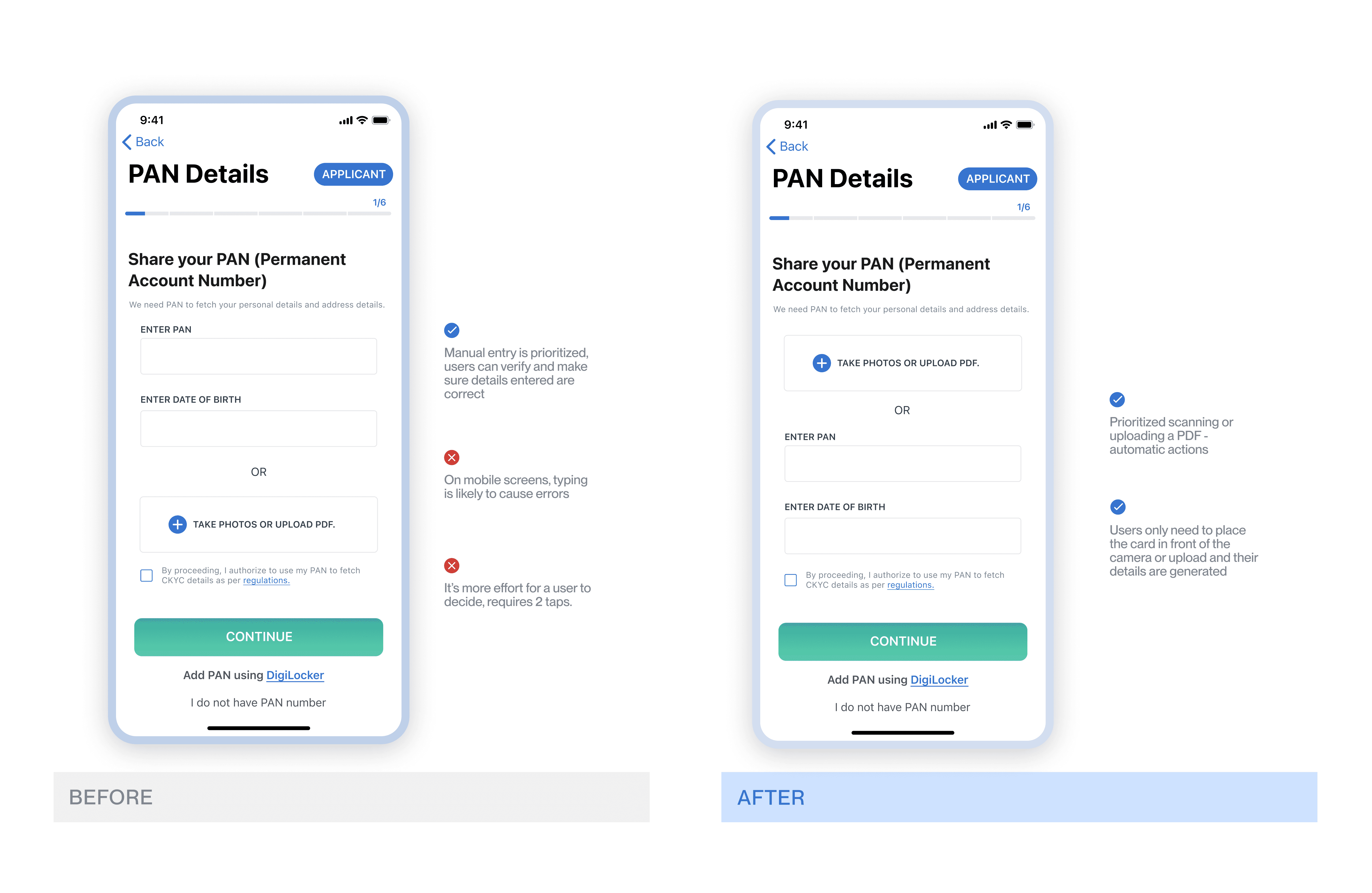 To minimize manual input and errors on mobile screens, we introduced options for users to auto-fill their address via GPS and scan their ID using their phone’s camera, reducing the time to complete these steps from 10 minutes to less than 1 minute.