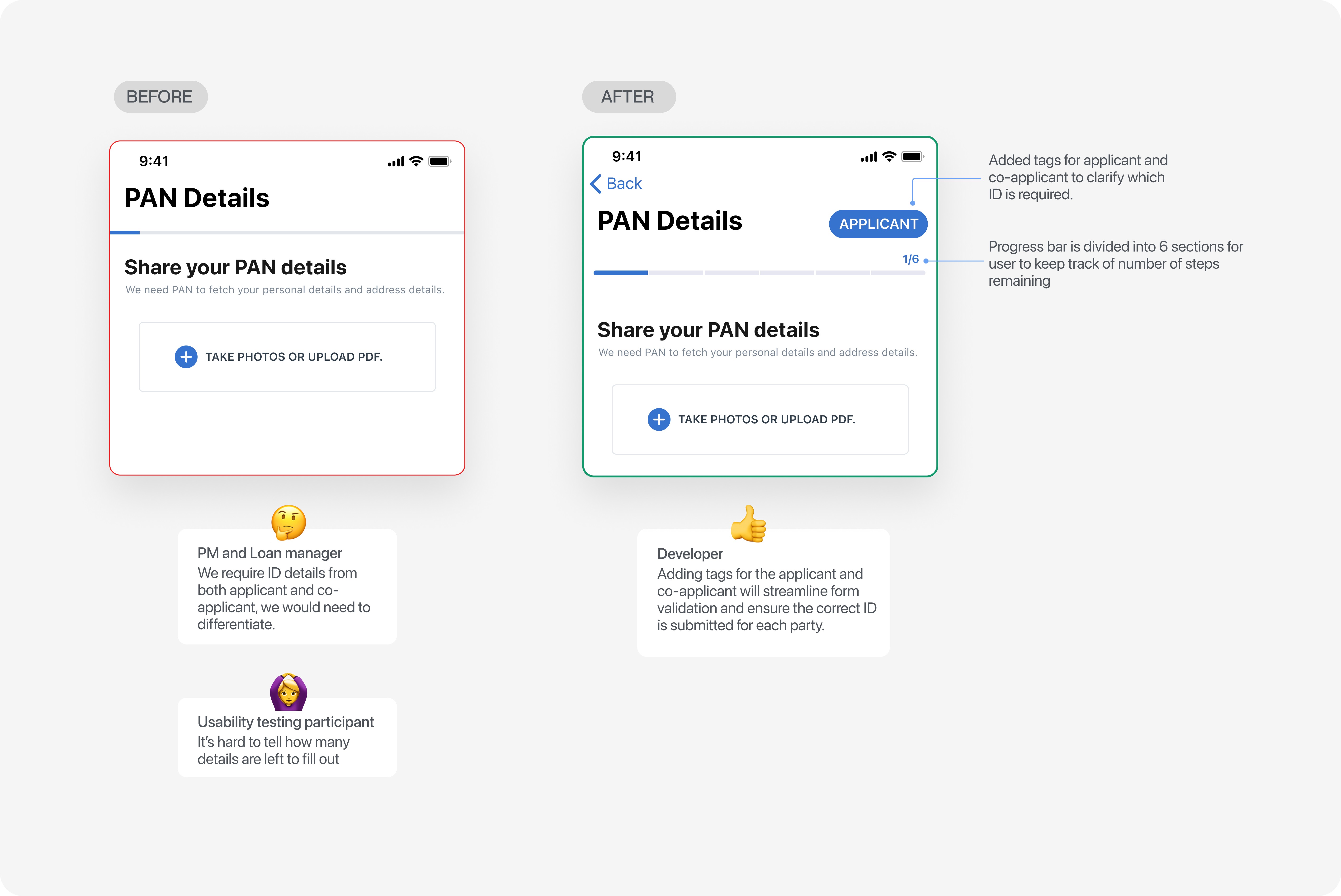 We chunked the long form [Hick’s law and Miller’s law] into 6 important steps to decrease in cognitive load and increase the completion rate by applicant and co-applicant. We also utilized sharing links and providing updates on the tasks dashboard to assist co-applicant to fill in details as well.